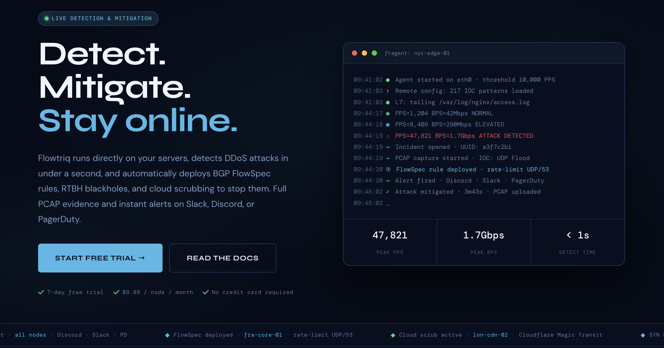 At $9.99/node/month (or $7.99 annual), with no traffic surcharges or per-alert fees, Flowtriq aligns cost with footprint, not incident volatility. That matters: traditional scrubbing and “per-clean-GB” models quietly penalize you for growth and seasonality. Add sub-second alerting (Discord, Slack, PagerDuty, OpsGenie, SMS, email, webhooks), immutable audit logs, status pages, and full PCAP capture for forensic proof, and you have an ops narrative your board understands: fewer incidents, faster resolution, measurable savings, and cleaner postmortems. This is direction and magnitude for founders—quantifiable resilience per dollar.